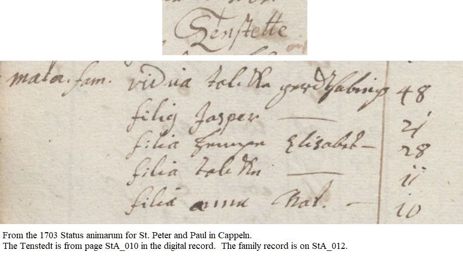 The Habing name for many families in the United States traces back to the Gerdhabing farm in Tenstedt near Cappeln, in Lower Saxony, Germany. While the farm name goes back to at least 1498, the Habings whose families settled near Teutopolis, Illinois in the 1840s only trace a connection to the farm (and its name) to around 1700. The 1703 church census for St. Peter and Paul in Cappeln lists the farm's residents as the widow Talcke (c1653-?) and her children Hempe Elisabeth (1679-c1725), Jasper (c 1682-1757), Talcke (c1692-?), and Anna Chatarina (1691-?).