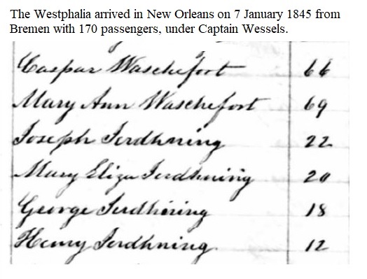 Joseph, Elisabeth, George, and Henry were brought to the United States by their grandparents Casper Heinrich Hoppe (1778-1858) and Catharina Adelheid Waschefort (1777-1849). Casper and Catharina's son John F. Waschefort had emigrated in 1832 and was heavily involved in the founding of Teutopolis, Illinois. Casper and Catharina were in Teutopolis by her death in 1849. George and Henry were there by 1857.