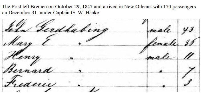 The second group of Habings arrived in 1847. Georg and Anna's third child (and thus the uncle of Joseph, Elizabeth, George, and Henry) Johann Gerhard Heinrich Gerdhabing (1803-1865) and his wife Maria Angela Rohe (1811-1885) came over with their children Johann Heinrich (1836-1910), Bernard (1842-1920), and Frederick Francis George (1844-1896). Another child, Casparus (1838-1845) passed away before they emigrated, and three daughters were born after their arrival, Elizabeth (1848-1898), Mary (1850-1871), and Catherine (1853-1895). They settled in or near Teutopolis shortly after arriving.